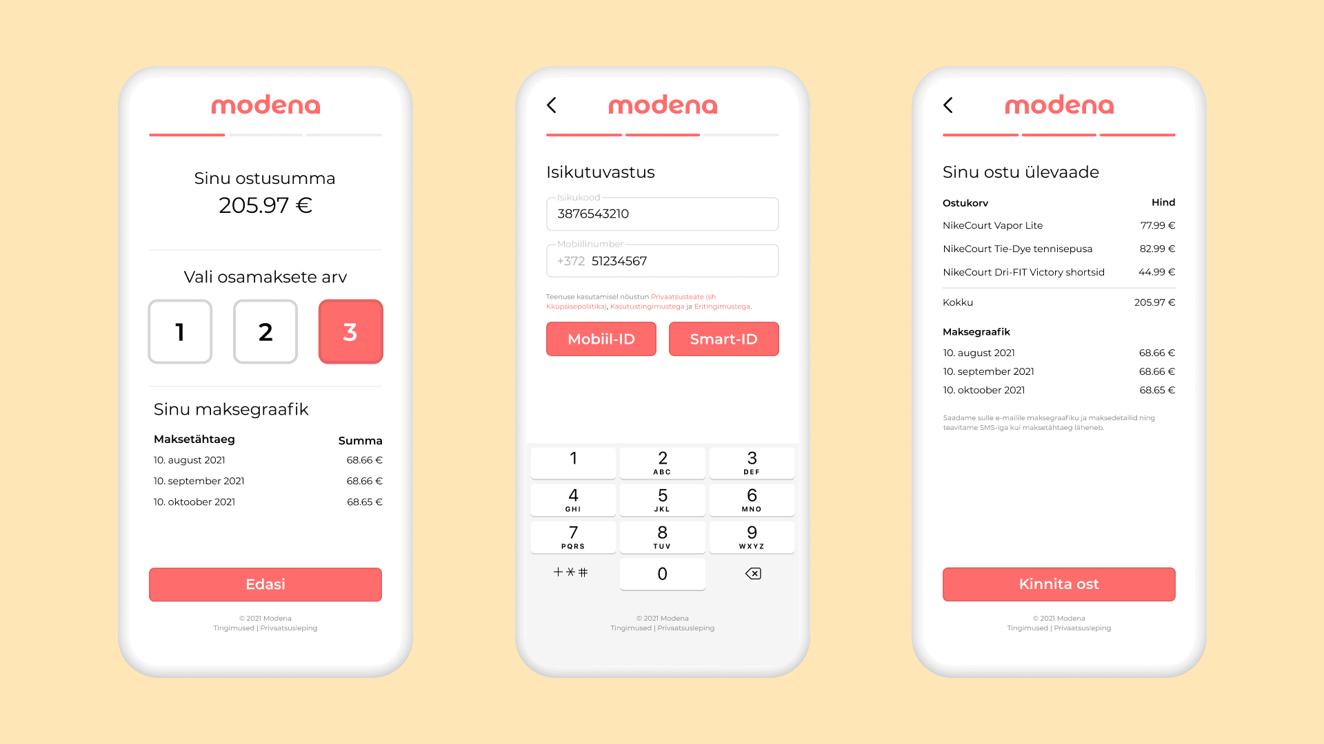 Modena on kodumaine, turvaline ja riskivaba. Kogu protsess on kliendile ääretult lihtne ja kiire: Vali osamaksete arv, Tuvasta ennast läbi Mobiil-ID või Smart-ID PIN1 ning lõpetuseks kinnita ost sisestades PIN2, ongi kõik.